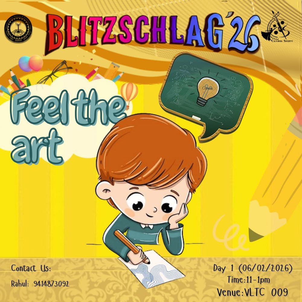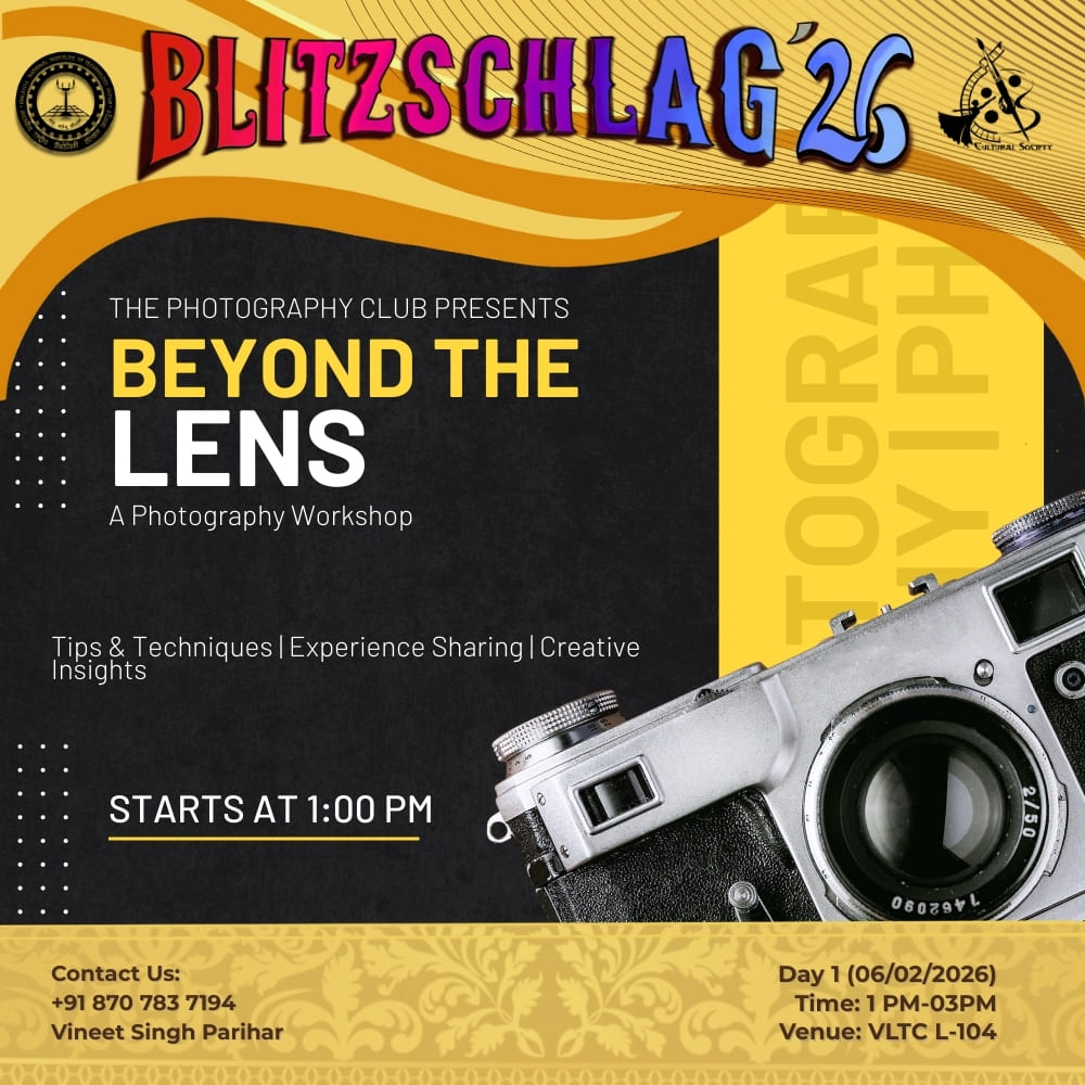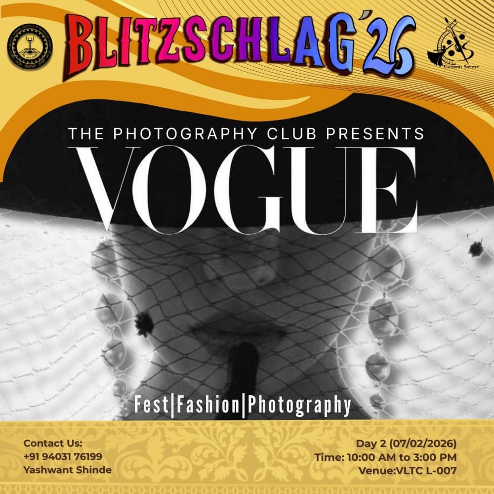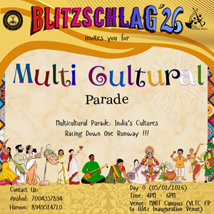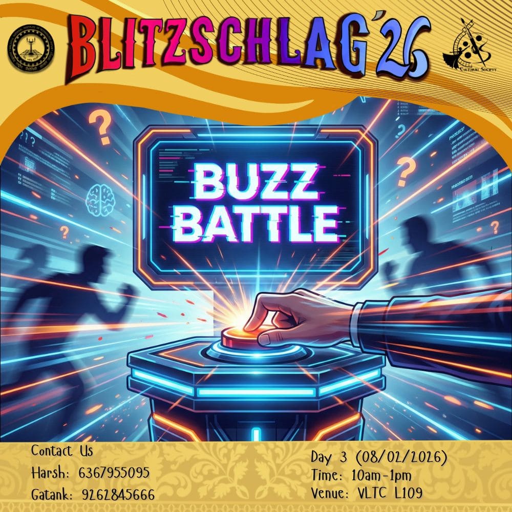 Parade throughout the campus from VLTC FP to OAT to Prabha Bhawan and then Inauguration of Blitz '26. It will be showcasing India’s diverse cultures and traditions. Other clubs (Drama, Music, Dance, Fashion, Creative Arts) will show some talent at different places (VLTC FP, OAT, Prabha Bhawan).