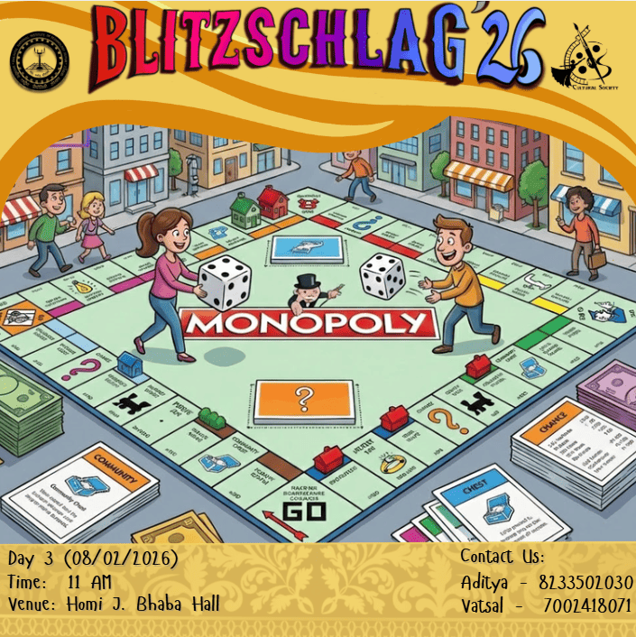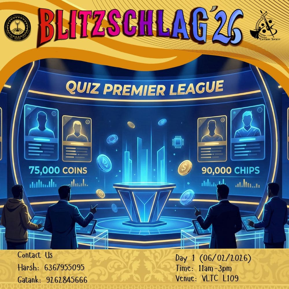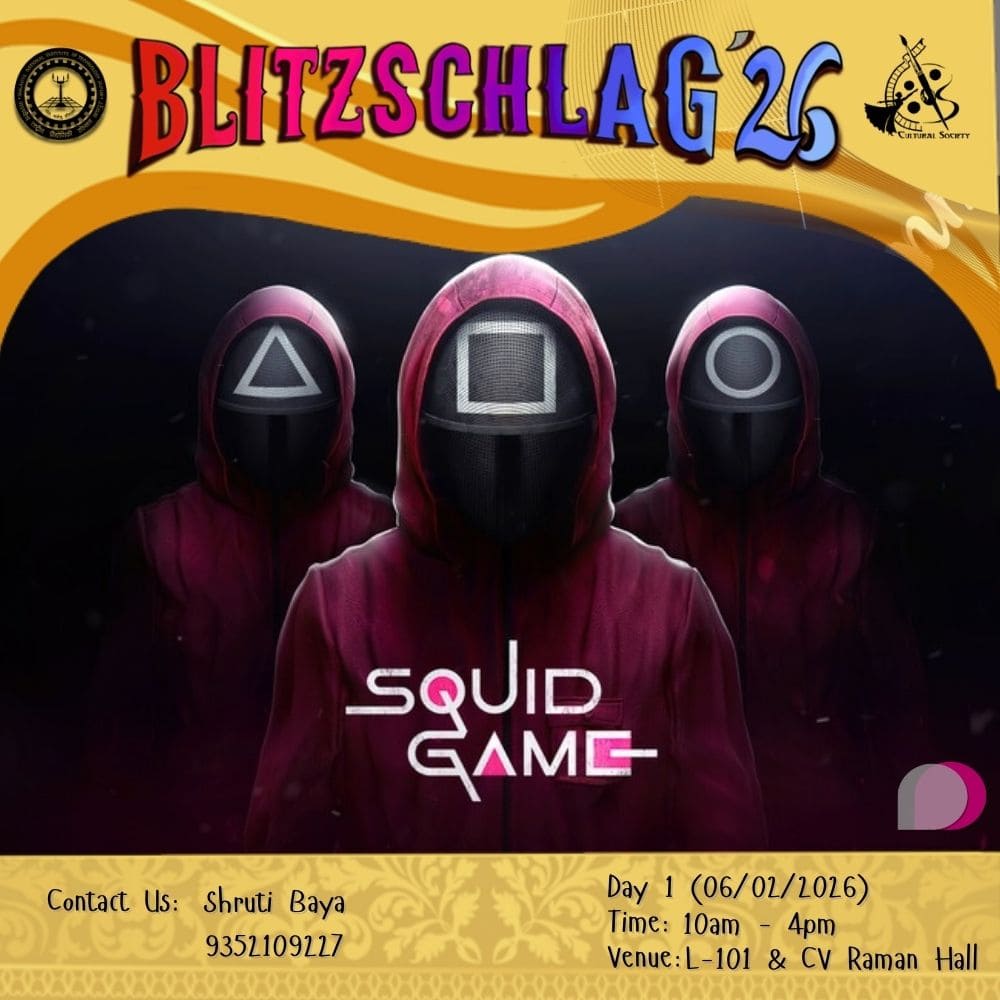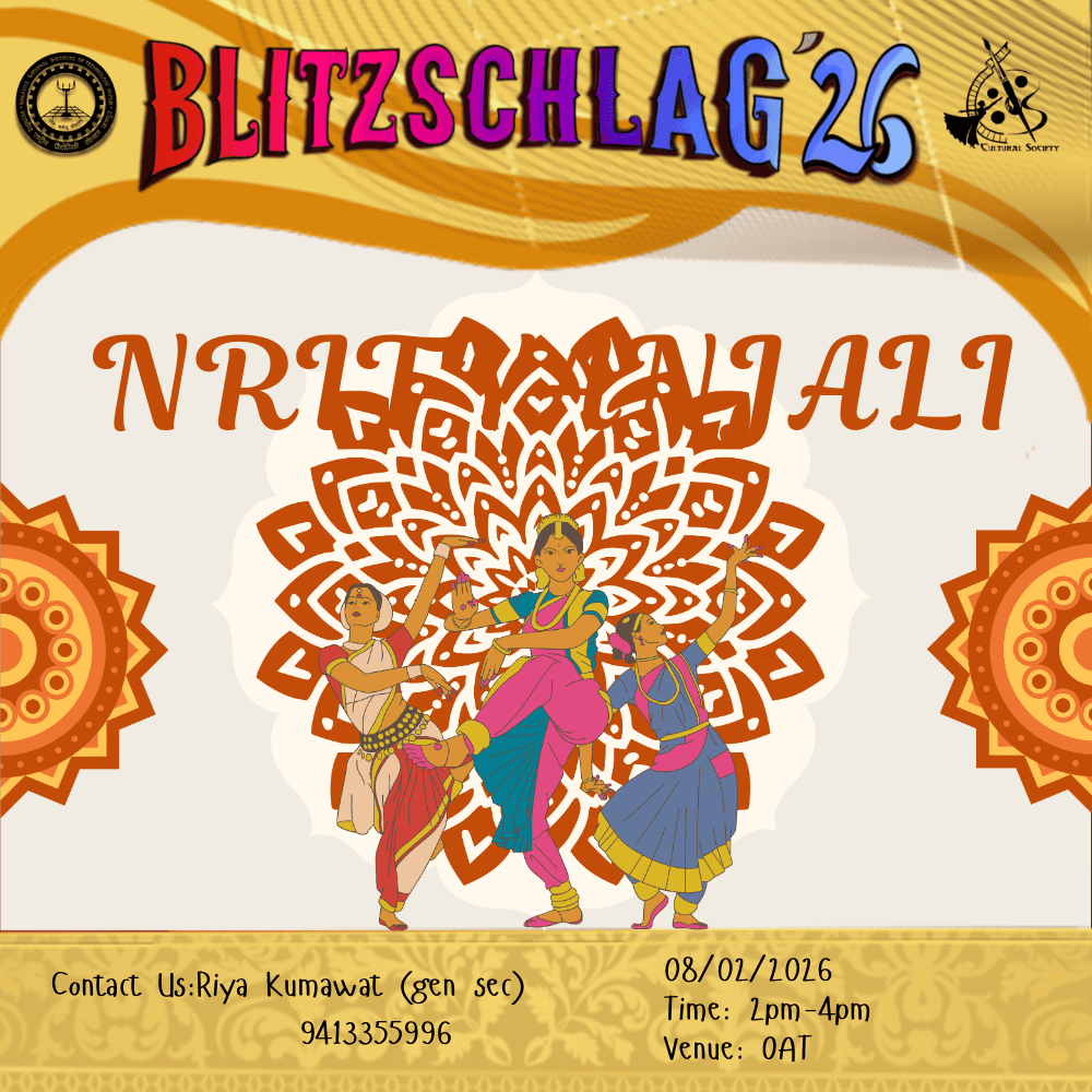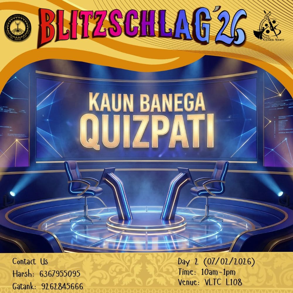 Parade throughout the campus from VLTC FP to OAT to Prabha Bhawan and then Inauguration of Blitz '26. It will be showcasing India’s diverse cultures and traditions. Other clubs (Drama, Music, Dance, Fashion, Creative Arts) will show some talent at different places (VLTC FP, OAT, Prabha Bhawan).