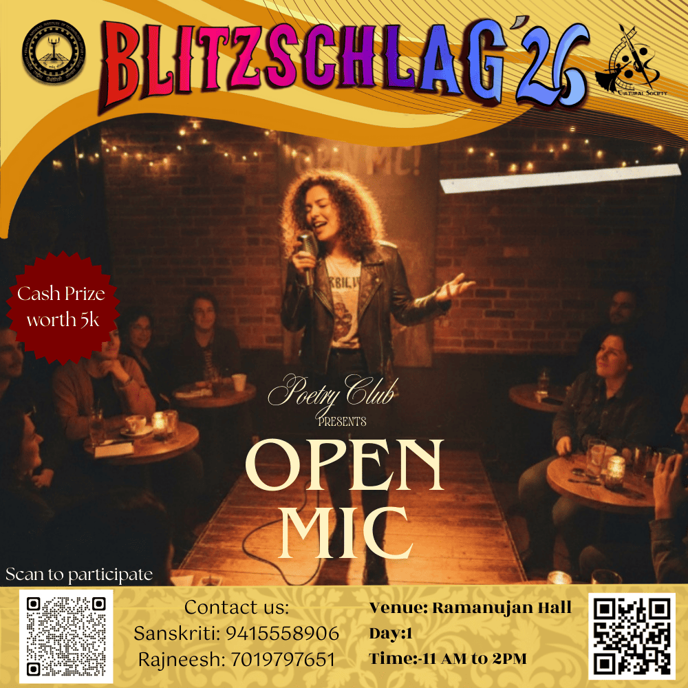 An open mic poetry session welcoming performances in any language. Participants can present original or published poems, ghazals, spoken word pieces, or lyrical poetry. The event aims to provide a safe and expressive space for poets to share emotions, ideas, and narratives while fostering literary appreciation among the audience.